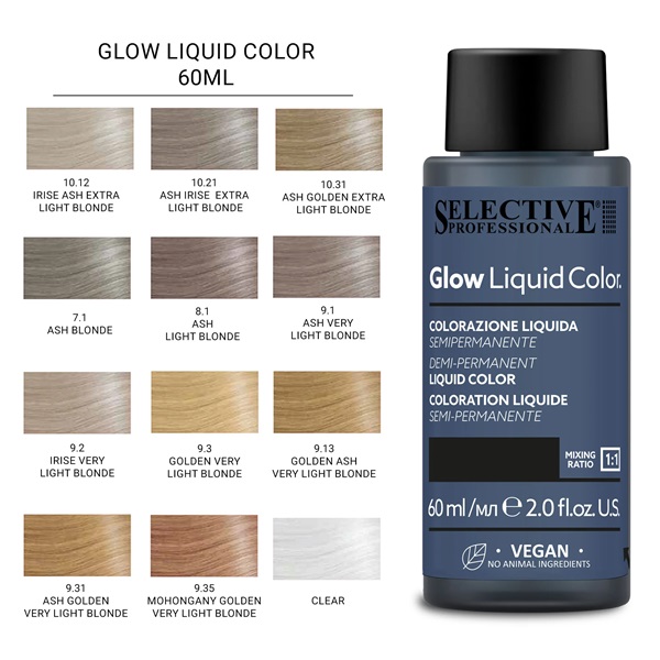 GLOW LIQUID COLORSistema di colorazione tono su tono per qualsiasi tipo di capello. Estremamente facile e versatile da utilizzare, grazie alla texture